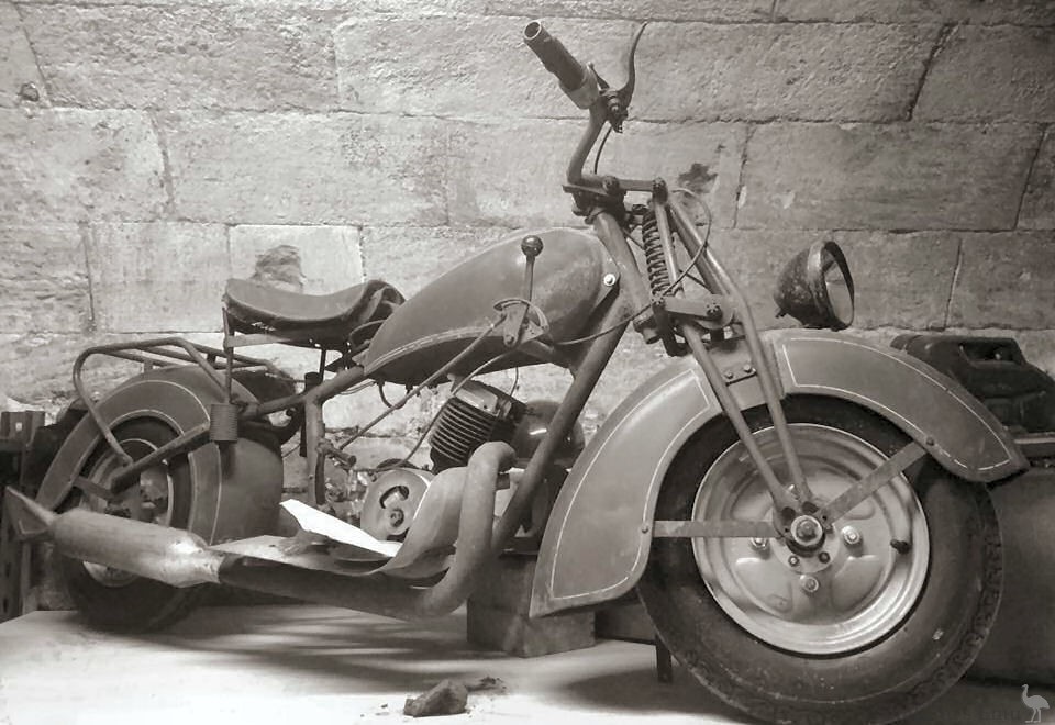 An unusual machine, it has a 250cc two-stroke engine with inlet and exhaust ports both at the front of the engine. The machine is quite low-slung with substantial, deeply valanced mudguards over automobile-style, small diameter wheels. It has girder forks and rigid rear, headlight mounted on front guard.