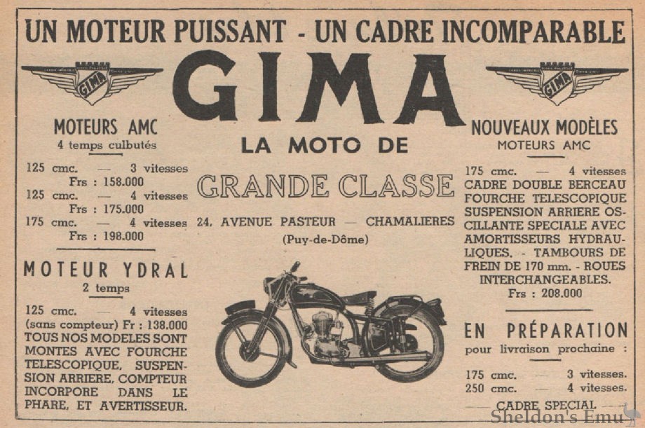 GIMA (Groupement Industriel Métallurgique et Automobile) was a French motorcycle manufacturer that built lightweight machines from 1947 until 1956, and resumed in 2005 with the production of a retro reincarnation of the original 1950s motocyclettes, but compliant with modern standards.