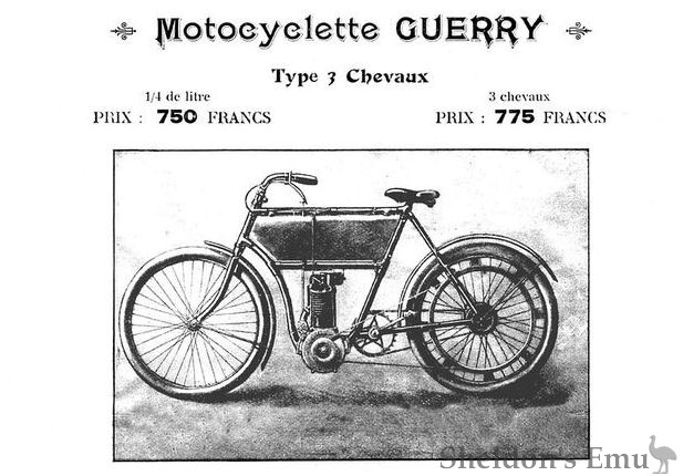 A later catalogue (thought to be 1906) offers machines from Guerry et Bourguignon with engines of 1 3/4, 2 1/4, 3 and 4 ch. at prices of 550 to 850 francs.