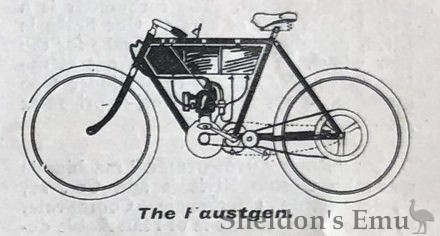 The HAUSTGEN Co., 103, Boulevard d' Italie, Paris, make two types of machines, a 1½ and 2 horse-power air-cooled, and a 1½ and 2 horse-power water-cooled motor. The motor is mounted in a good position in front of the bracket. The drive is by means of a chain. The cooling tank carries about seven pints, and the carburetter is a simple type of spray, with suction feed. Control of speed is effected by means of a lever moving over a quadrant. The capacity for petrol is rather limited, only about three-quarters of a gallon being the amount carried. A capacity for 1½ pints of lubricating oil is provided. The price of the 1½ h.p. machine is £36.