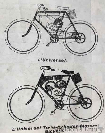 The "UNIVERSEL" two-cylinder motor-bicycle is one of the most interesting features of the motor-bicycle exhibits. It is remarkably compact and light, and the motor develops three horse-power. It has combined flat belt and chain drive. The motor is clamped in between the main and down tubes. A spray carburetter is used. On this stand several small motors, both air and water cooled, are shown. This machine is made by Porteus Butler, 24, Passage de l'Opera, Boulevard des Italiens, Paris.