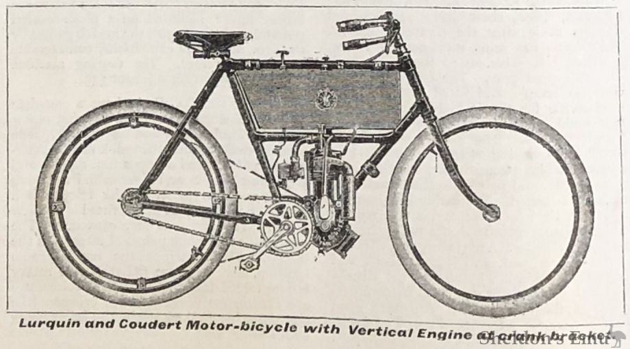 Lurquin and Coudert, Rue du Faubourg, St. Antoine, Paris, have two patterns of motor-bicycles exhibited. One of these has the motor placed vertically in the frame, being clamped about the centre of the down tube. The motor is of 1¾ h.p. , and the drive is by a flat belt. The carburetter and battery case are placed in the angle between the horizontal and diagonal tubes. An F.N. carburetter is fitted, and in this pattern a lubricator and pump is attached to the top tube. The other pattern has the motor fitted in a special frame, the crank case being bolted to special lugs. Ignition is by coil and accumulator, these being placed inside the tank case compartment. The control of the speed is by means of a spark advance lever working across a kind of ratchet. Two brakes are used, namely, a Bowden back and front tyre brake. The weight comes out at about 8olbs. The motor set can be purchased separately, and the complete machine comes out at £34