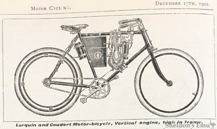 The company's first motocyclette appeared in 1902, with two of these appearing that year at Deauville piloted by Charles Coudert and Edmond Lurquin.