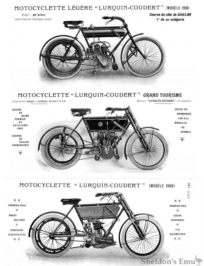 From 1901 until 1914 1 Lurquin-Coudert produced "voiturette-tricars"; a twin-cylinder model ran in the touring class at the 1907 Chateau-Thierry hillclimb, and cyclecars with V-twin Train engines went into production beginning in 1910.