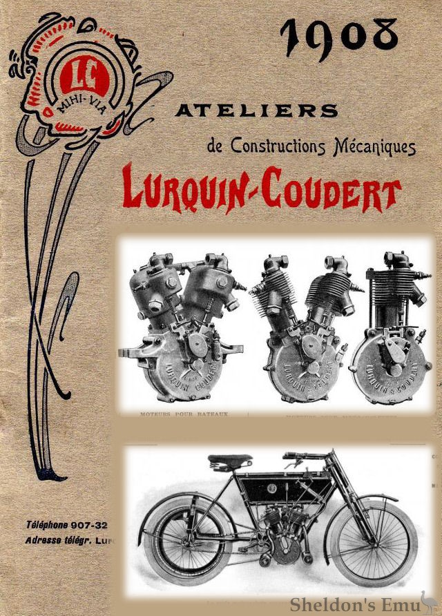 In 1906, ownership of the company passed to Charles Lacour of 19 rue Planchat, Paris. Lacour was closely associated with the L&C firm, and the C.Courdert models of 1909 were all but identical to those of L&C. The new owner continued to market the Lurquin & Coudert brand, presenting a variety of tricars and motorcycles, and they also revealed the first of their cyclecars (voiturettes). For 1910, the range included a 45° racing V-twin motorcycle of 803cc (80x80mm B/S), and their voiturettes had taken on the appearance of automobiles, some of which were powered by water-cooled V-twins and others by inline fours of 10, 14 and 14hp.