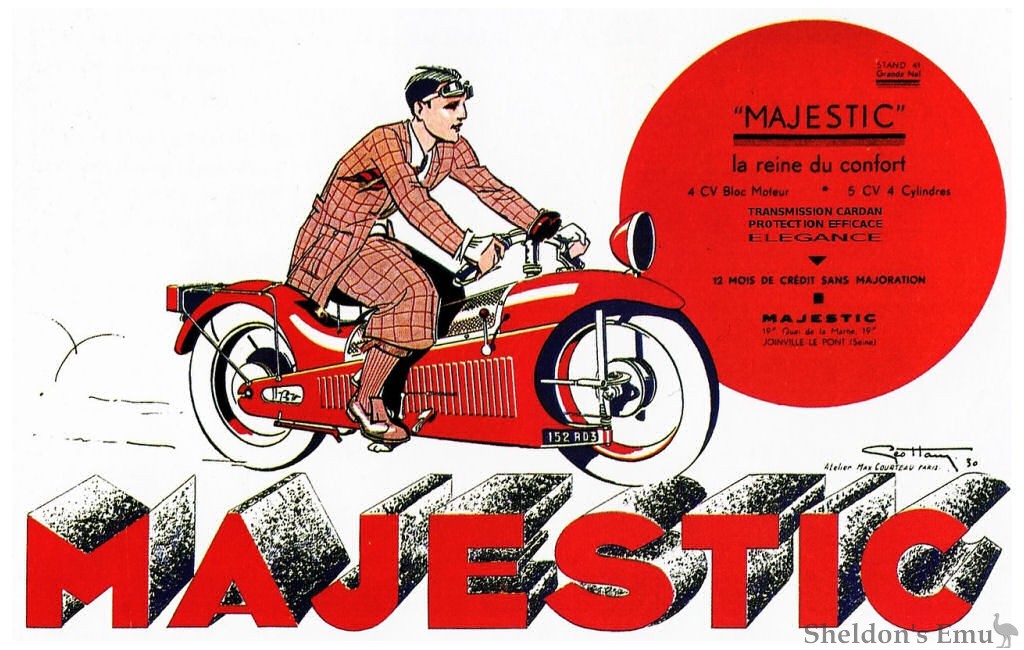 The Dollar marque was acquired in about 1931 (as the depression years were biting seriously) by Metallurgical and Industrial Omnium, owner of Chaise. Over a period of five years roughly 100 Majestic machines were produced, powered by 350cc & 500c single-cylinder engines from Chaise, JAP V-twins, and four-cylinder engines from Cleveland. The Chaise narrow-angle V4 engine may have been fitted to some Majestic machines, but is unclear as to whether this was the case. Production ceased in 1933 when Dollar went out of business.