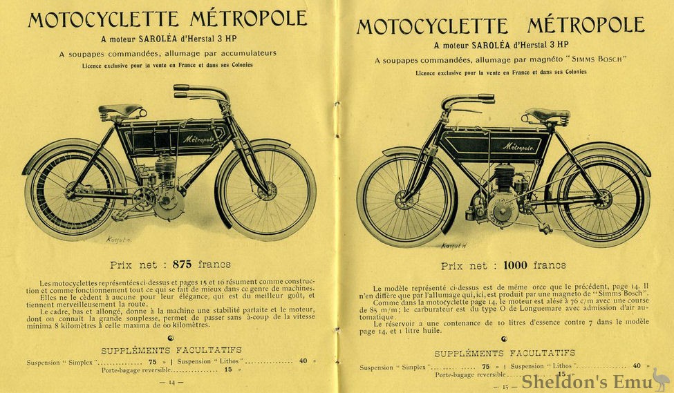 The 1905 L'Acatène Métropole catalogue lists three Métropole motorcycles. These are believed to be rebadged Saroléa machines with belt transmission.