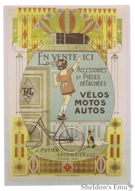 Later the firm became Ets Potier Lecorcier building the 113cc Velotouriste, and around 1930 it was taken over by JP, Ets Jeanne and Philippe. The P.A.L. name remained in use until at least 1931, catalogues advertising a range of motorcycle accessories.