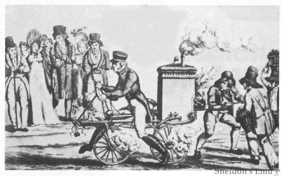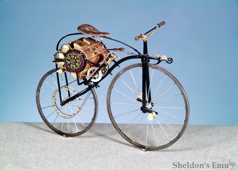 Louis Guillaume Perreaux produced "La Perreaux" motorcycle in 1871. A steam engine was installed under the saddle, and it has a large spoked front wheel and a smaller spoked rear wheel which was driven by belts from the remarkably compact steam engine.