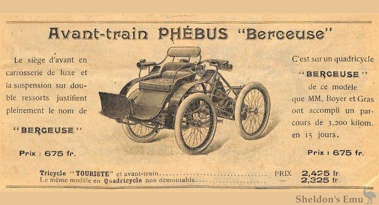 Boyer exhibited their Phebus tricycles and quadris at the Salon des Tuileries in 1899. The machines are said to have had both Aster and De Dion engines.