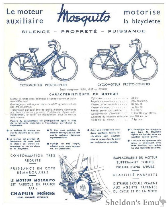 Presto reached an agreement with Garelli to built Mosquito engines under licence. A new factory was built for the purpose and the first engines rolled off the production line in 1950, along with two Presto frame kits, Confort and Sport.
