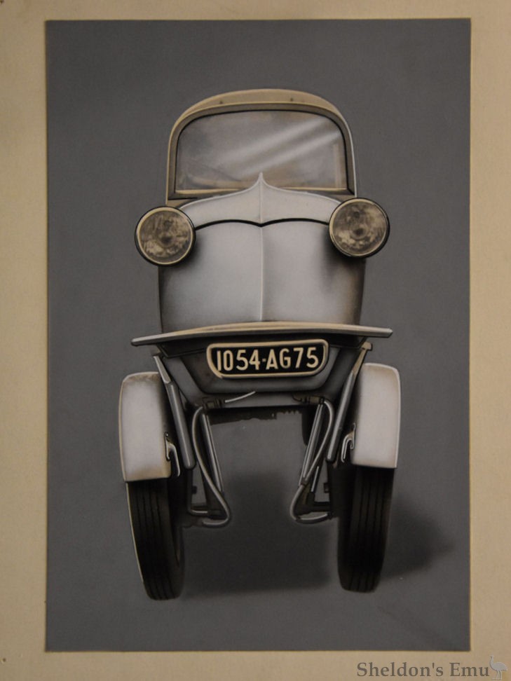 Manufactured by Robert Hannoyer of Paris from 1951 to 1954 using 175cc AMC four-stroke engines, these microcars were built in a variety of forms. With the appearance of a three-wheeler, the minicars actually had two wheels close together at the rear, and the front wheels could be brought closer together by raising the machine's nose, allowing entry to narrow laneways.