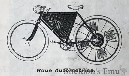 The "ROUE AUTOMOTRICE" machine is made by Gaston Rivierre and Co., 28, Boulevard de Courbevoie, Courbevoie, Seine. This machine is of remarkable design, having a four-cylinder motor, in which the cylinders alone rotate with the wheel. Thus there is no chain or gearing, and the drive is quite direct. The whole of the regulation is effected by one lever. The ignition is on the high tension system, and a four-part contact breaker causes each cylinder to fire consecutively.