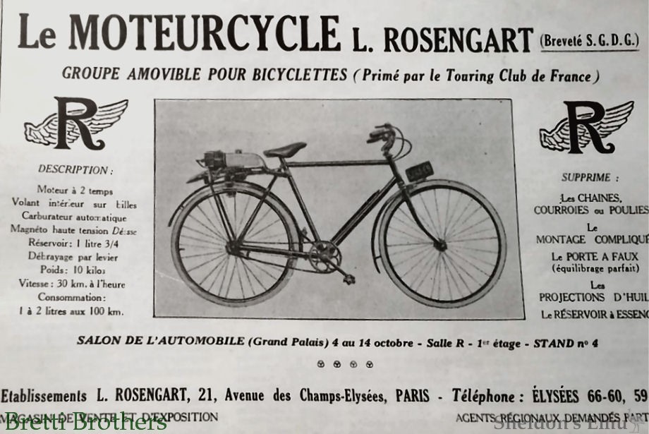From 1922 to 1924* Lucien Rosengart produced powered bicycles named Le Moteurcycle which were also sold using the name Moteurcycle L. Rosengart. These were powered by 98cc Train engines, and at least one model used a 206cc engine.