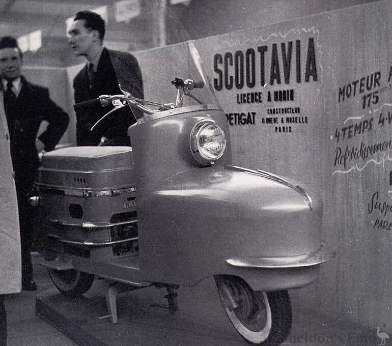 Scootavia were luxurious and innovative scooters fitted initially with Ydral engines, first advertised in 1949 with production beginning probably early in 1950. For 1951 there were design changes along with a new engine, the AMC 4-speed 175cc four-stroke. There was an association with M. Petigat, who built the scooter under licence from 1952 until end of production in 1954.