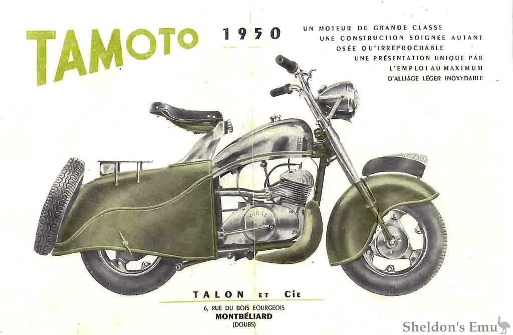First produced in 1949 by M. Artagnan, the machine was fitted with 125cc Ydral engine and was manufactured on demand, with only 30 built. The Tamoto had the appearance of a scooter but shared many qualities of a motorcycle, somewhat like the MV Agusta Pullman.