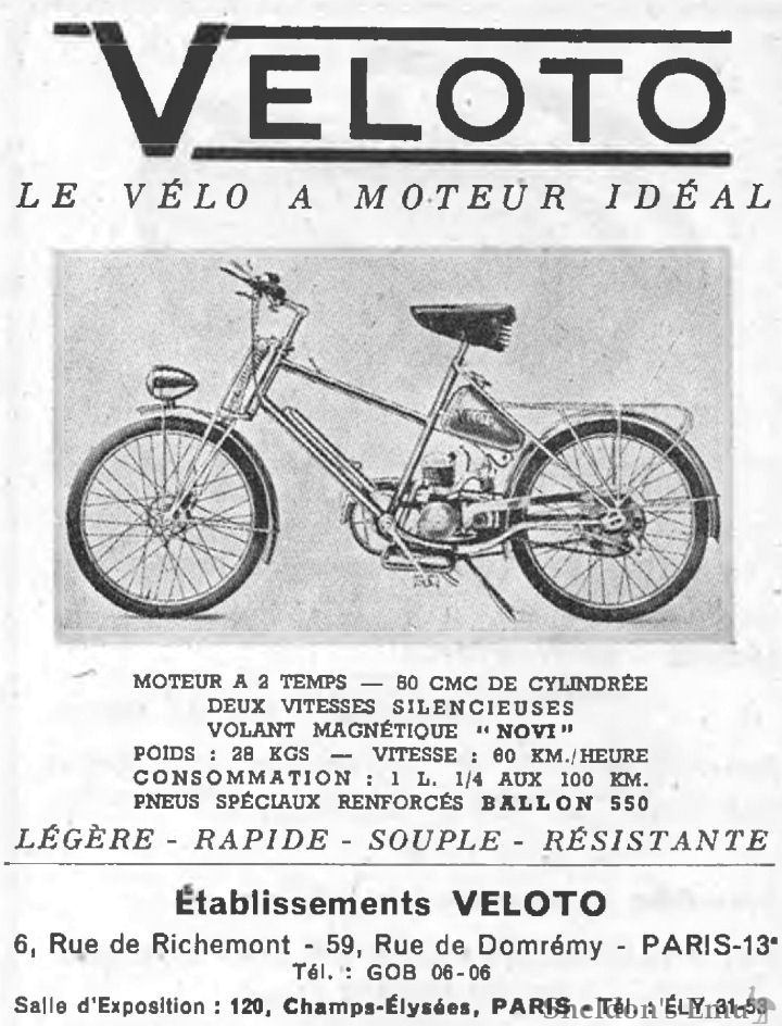 Built from around 1948 using their own 50cc engines which were mounted in an unconventional fashion behind the pedal crank, resulting in a velomoteur with a long wheelbase. The fuel tank was mounted below the seat and directly above the spark plug.