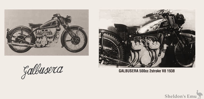 At the 1938 Milan Show two exceptional machines from Galbusera appeared, a 249cc V-four two-stroke and a supercharged two-stroke V8 of 498cc created using a pair of counter-rotating 250 V4 blocks bolted to each end of the gearbox. It created a sensation.