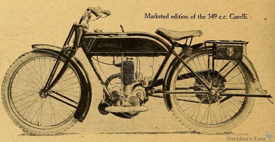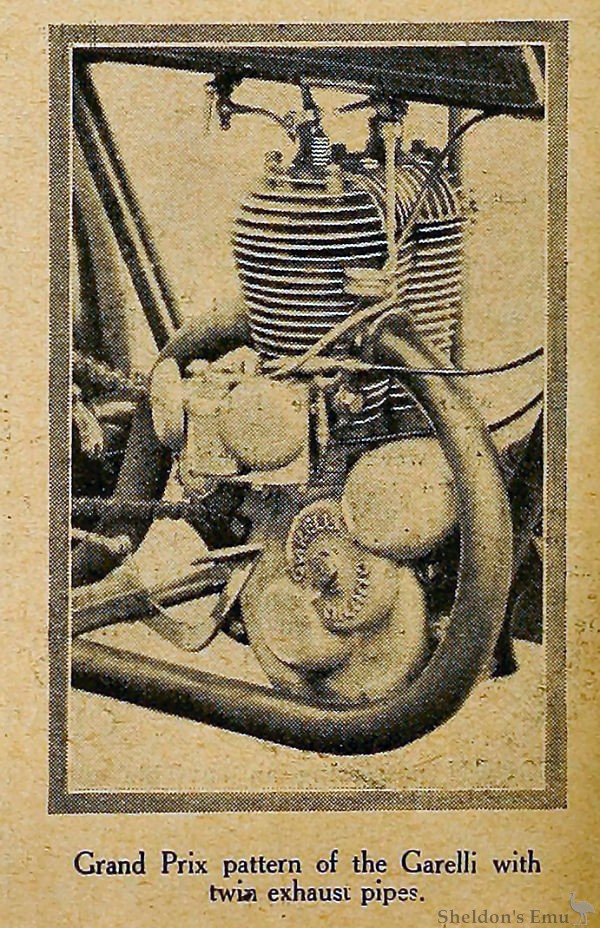 Few examples of departures from accepted practise, such as the Garelli is, have attained success at the very out-set of their careers, but with this machine success was obtained not only in the small field at Strasbourg but in a much larger and more dangerous one of 39 riders on the Monza track in the Gran Premio delle Nazioni. It must be mentioned here that the engine design is not actually novel and owed its origin to an English inventor, but the Cavaliere Garelli was the first to adapt the principle to a motor cycle engine.