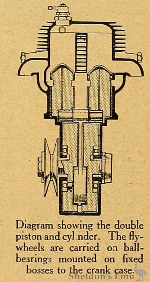 On the mixture supplied by a one-lever Zenith carburetter (fitted with additional extra air inlet) being drawn into the crank case and compressed, the transfer port, which is inside the cylinder (actually in the dividing wall between the two) is uncovered by the left-hand piston, fills the left-hand cylinder and the combustion chamber and helps to excel the residue of burnt gases in the right-hand cylinder as the exhaust port is still uncovered; the pistons then rise and compress the charge which is fired by the plug in the left-hand cylinder, but as there is a common combustion chamber both pistons receive the explosion pressure.