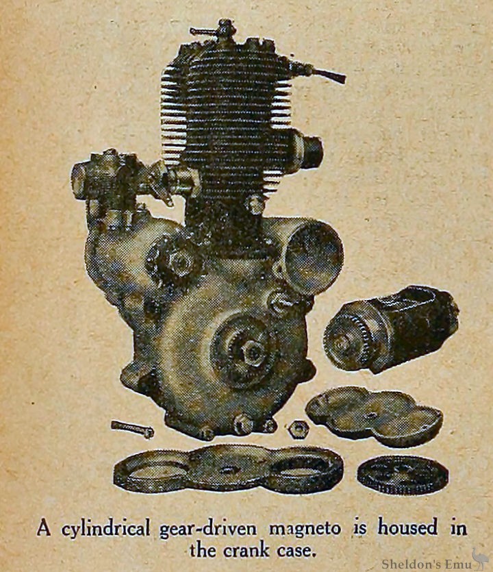 Equally as neat as the clutch is the Mea-Garelli magneto, which is likewise entirely enclosed in the unit, but is easily detachable therefrom.