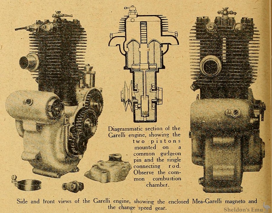 Side and front views of the Garelli engine, showing the enclosed Mea-Garelli magneto and the change speed gear.