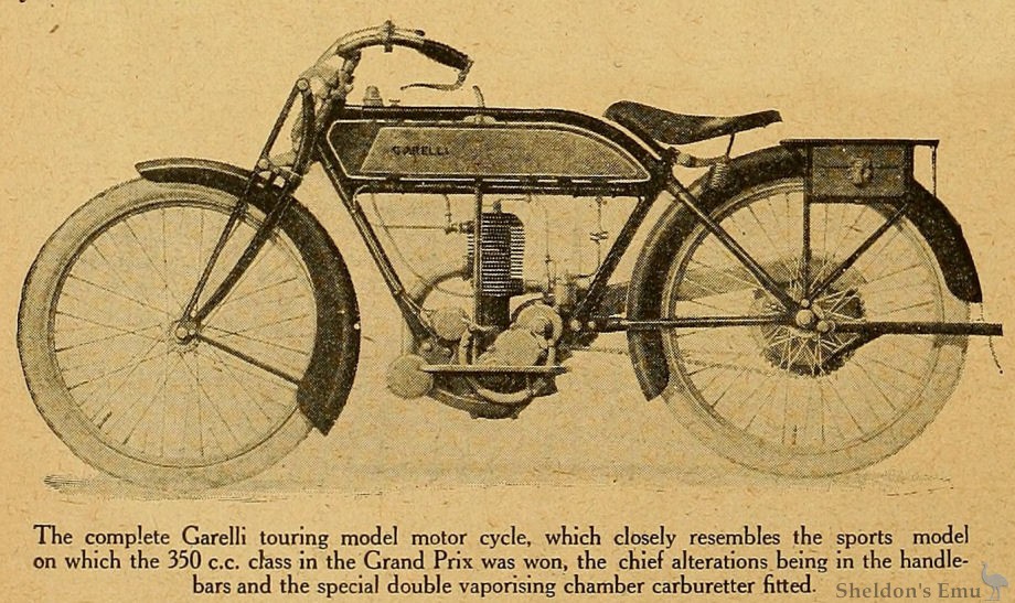The complete Garelli touring model motor cycle, which closely resembles the sports model on which the 350 c.c. class in the Grand Prix was won, the chief alterations being in the handle-bars and the special double vaporising chamber carburetter fitted.