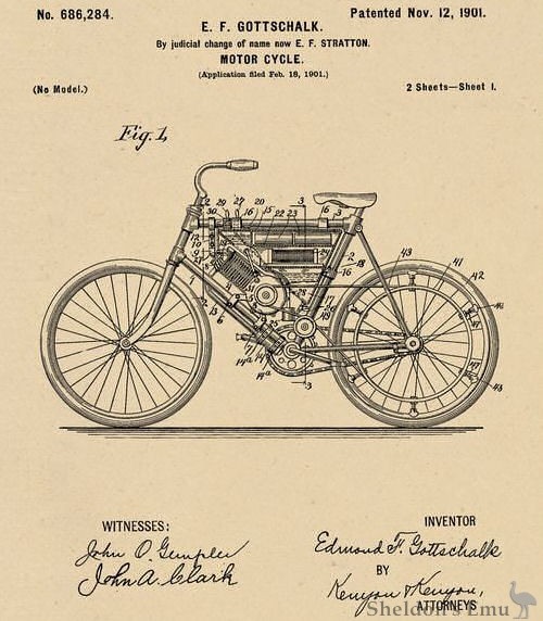 Although there is no indication that they built motorcycles, and tricycles barely get a mention, a motor cycle was patented by Edmund Gottschalk in America in November 1901. Gottschalk 1901 Patent
