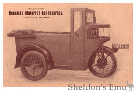 The Hennicke Motorrad Anhänger was termed a motorcycle trailer, but was actually a motorized tricycle with one wheel at the front. It seated three, driver in front and two passengers behind, and was provided with a folding cover.