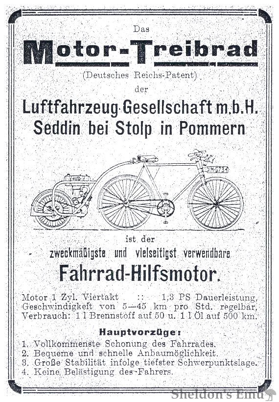 Manufactured by Luftfahrzeug Gesellschaft of Berlin, an aircraft company, shortly after the end of World War One. In 1919 they built a Fahrrad-Hilfsmotor in the form of a powered trailer which pushed a bicycle, thus putting the cart before the horse.