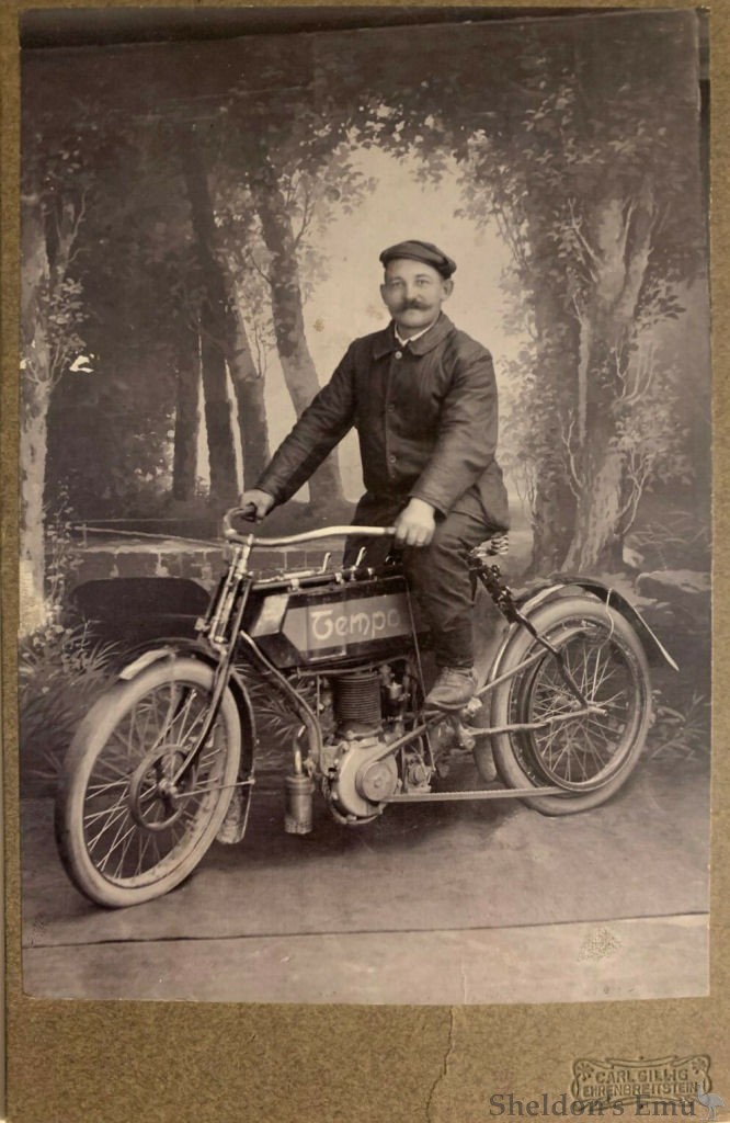 A photograph by Karl Gillig of Ehrenbreitstein shows "Tempo" on the fuel tank, and the styling of the machine indicates a date of around 1905.