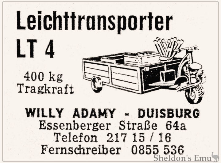 The three-wheeled light transporter model LT 4 was advertised with a load capacity of 0.4 tonne.