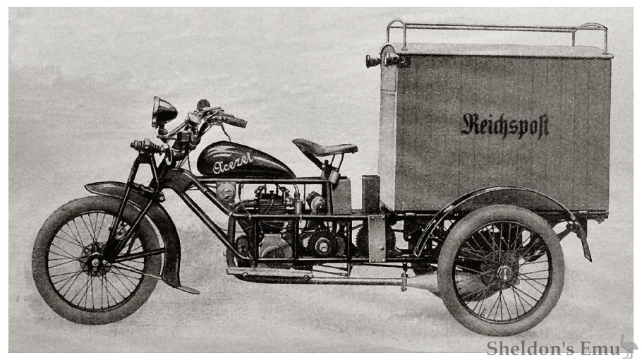 The Acezet firm produced motor tricycles for passenger and freight transport in Berlin. The front forks were of pendulum style with motorcycle handlebars. The moto-tricycles were driven mostly by a Kühne engine of 350cc displacement, the drive via a three-speed Hurth transmission. The main customer of Acezet tricycles was Deutsche Reichspost in Berlin.