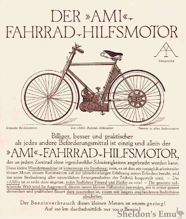 Built auxiliary bicycle motors of 98cc rated at 1hp which were installed in front of the pedals. The engine, according to Tragatsch, was designed by Heinrich Hildebrand, one of the creators of the world's first production motorcycle, the Hildebrand & Wolfmuller.