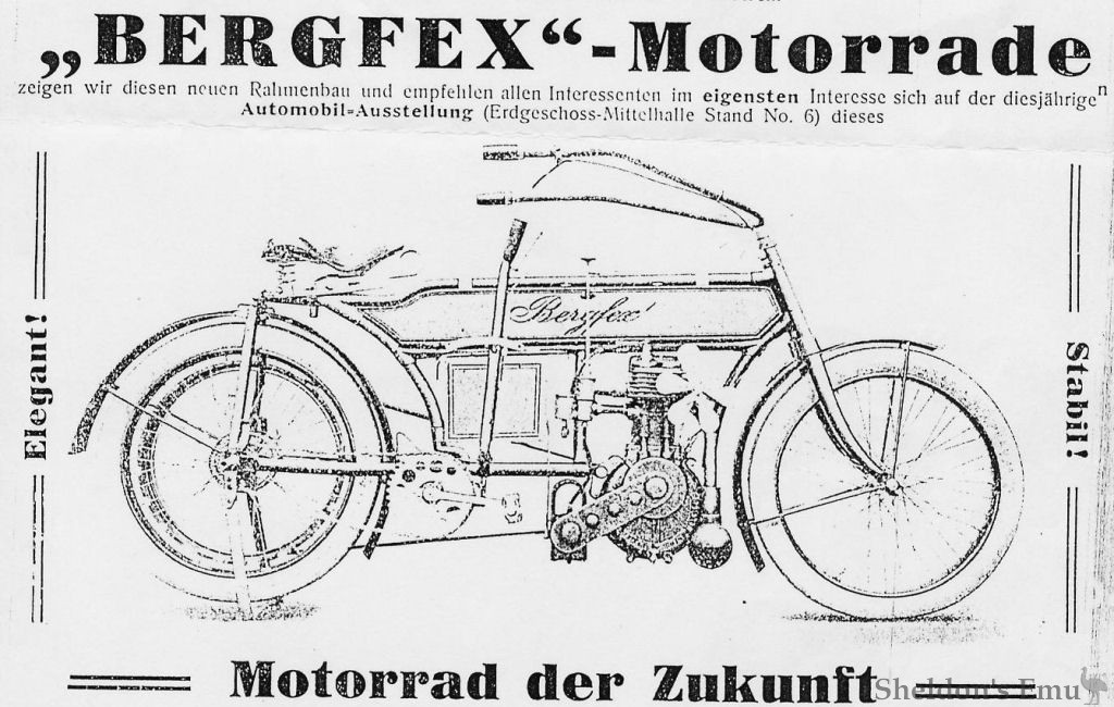 These were long-wheelbase motorcycles fitted with a variety of relatively powerful V-twin engines from Antoine, Fafnir, Kelecom, NSU, Minerva and possibly Grade. Bergfex also fitted their own engines.