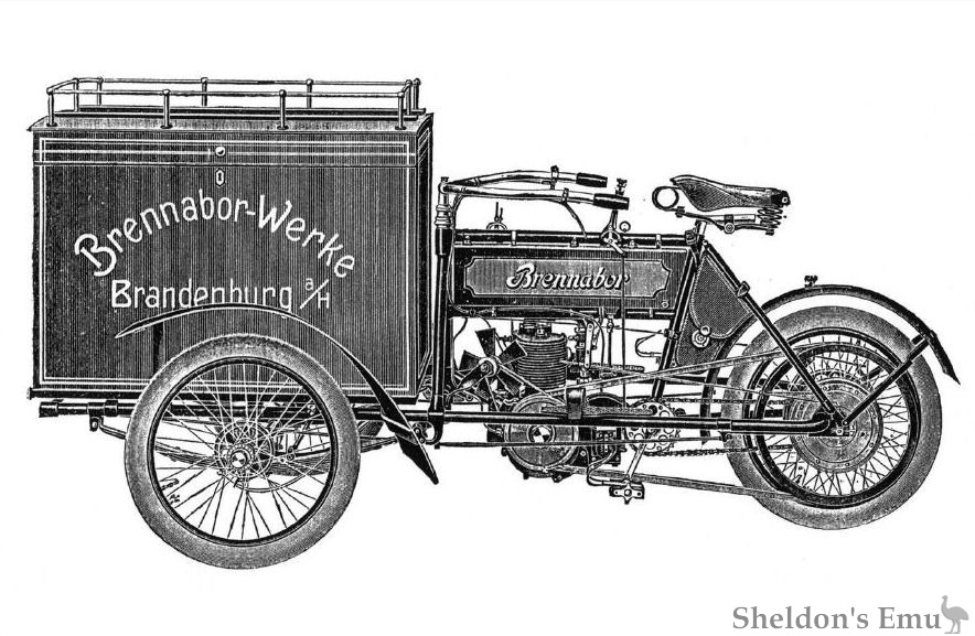 Brennabor, an ancient name for Brandenburg, was established in 1871 by the brothers Carl, Adolf and Hermann Reichstein who produced baby carriages as their main product and became Europe's largest manufacturer. When the English bicycle craze hit Germany they were not slow to adopt and soon were building 20,000 units annually. The factory employed some 2000 workers and exported to the four corners of the earth. In 1902 they began production of motorcycles and cyclecars fitted with Fafnir and Zedel V-twins, and these continued to be marketed until shortly before WWI. [1]