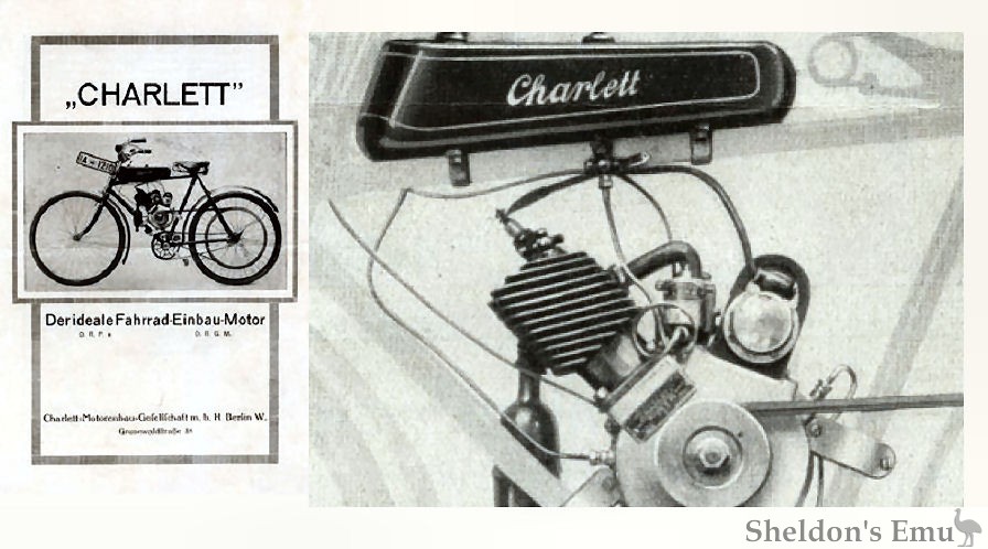 The Charlett was a side-valve cyclemotor of 195cc. The engine was also supplied to other manufacturers including DEFA. Production ceased in 1922 due, it appears, an accusation of the theft of intellectual property by the owner of the Gruhn engine company.