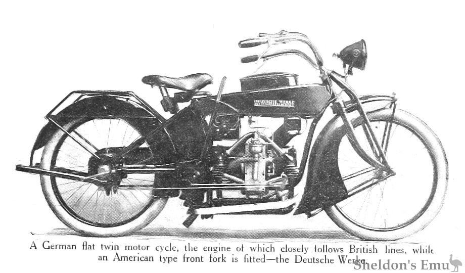 A German flat twin motor cycle, the engine of which closely follows British lines, while an American type front fork is fitted - the Deutsche Werke.