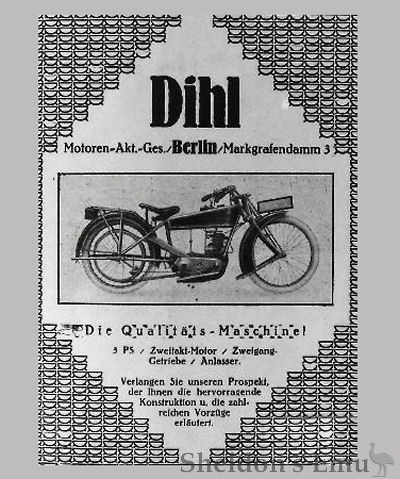 Dihl Motoren G.m.b.H was founded in Berlin by Rudolf Heßler in 1921. Located in Boedikerstraße in the Friedrichshain district, in 1924 the company name was changed to "Minerva Kraftfahrzeugvertriebs AG".