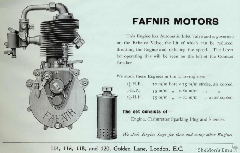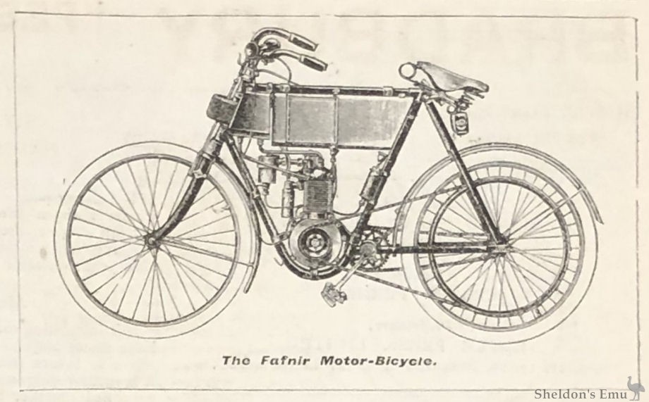 FAFNIR engines are manufactured by the Aix-la-Chapelle Steel Works, a long-established firm which is known throughout the whole Continent for the quality of the material employed in the various branches of engineering with which it deals. The Fafnir firm is one of the oldest connected with the construction of motor cycle engines, and has been in the business over fourteen years. The address of the London branch is 211, Upper Thames Street, E.C.