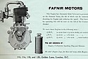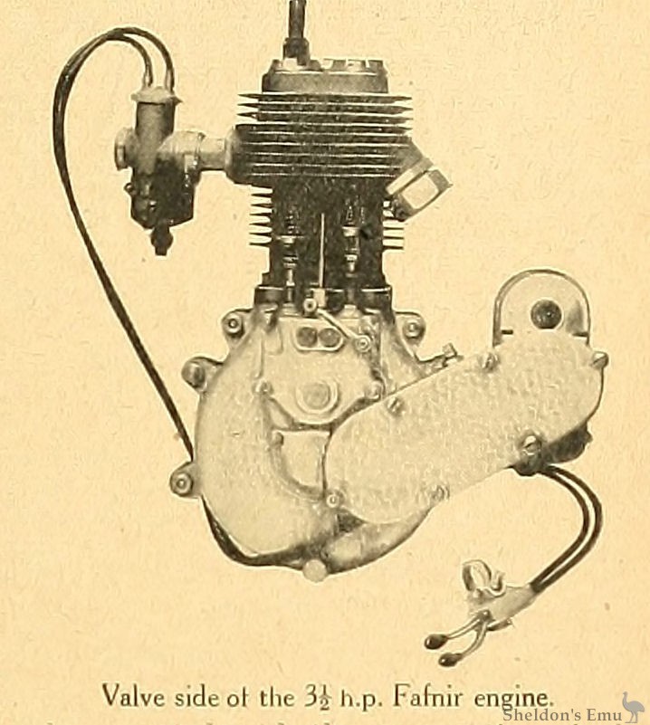 Besides the 3 ½ h.p., the Fafnir Co. supply a 5-6 h.p., 70x80 mm. twin; a 4 ½ h.p., 86x96 mm. single; and a cycle car engine. 85x88 m.m. twin, which can be had either water- or air-cooled, and fitted with or without a leather cone clutch.