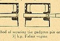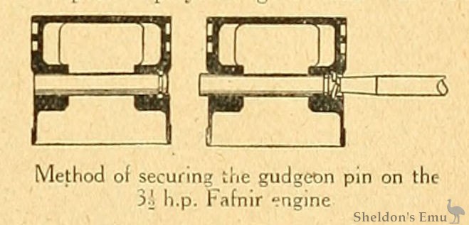 The illustration of the Fafnir method of holding the gudgeon pin is also interesting. It will be noted that two rings only are fitted to the piston, and that the gudgeon pin is slightly tapered, and has a slot cut in its narrow end. A spring ring is fitted into a slot in the piston itself, and on the gudgeon pin being driven through the ring springs into the slot and holds the gudgeon securely.