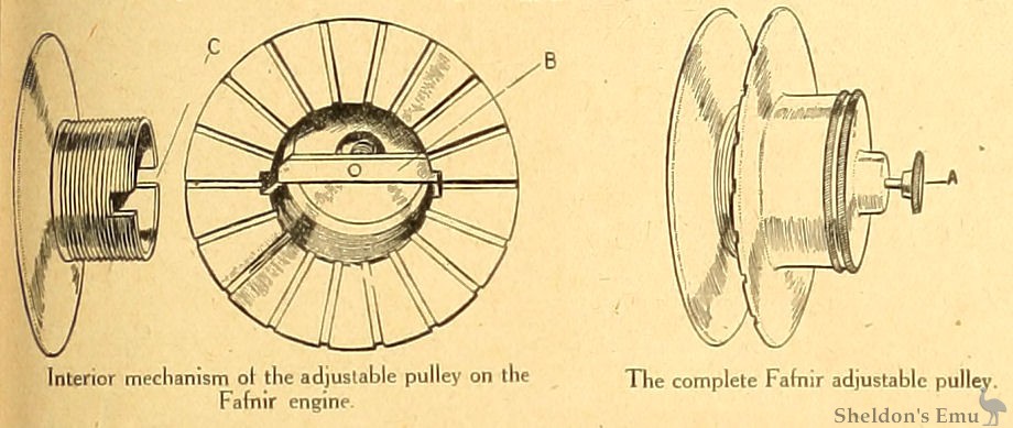 To most of these models the Fafnir two-speed epicyclic gear box can be fitted. It is designed to bolt straight on to the crank case, and is driven by means of three pinion wheels direct from the crankshaft to the belt pulley, which runs at half the engine speed.