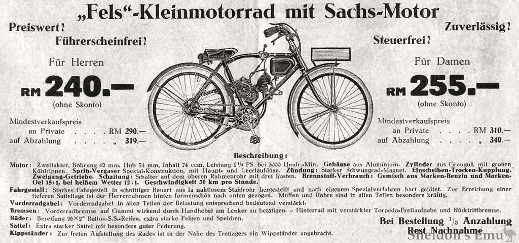 The firm is believed to have been established in 1907, and lightweight motorcycles and mopeds were built in 1931 and 1955. The Fels Kleinmotorrad of 1931 was available "Für Herren" and "Für Damen" and was powered by a 74cc Sachs. The Luxus-Sport moped of 1954-55 had a Zundapp 49.9cc engine.