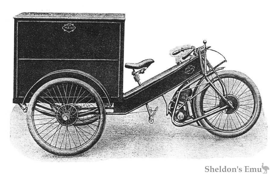 They also built utility three-wheelers powered by 173cc DKW engines which were attached to the rear of the front fork with friction-drive to the front wheel.