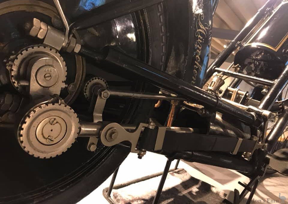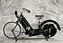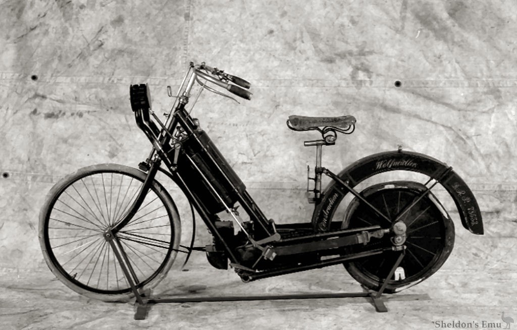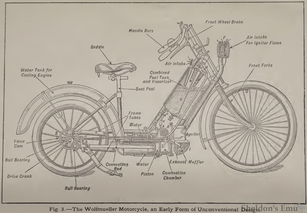 The water-cooled engine powered the rear wheel directly, in the manner of a steam engine, and the rear mudguard served as a reservoir for evaporative cooling. A surface carburettor provided the mixture, the exhaust control was from the rear wheel, with the inlet tract via a flutter valve. Adjustable rubber bands supported the engine.