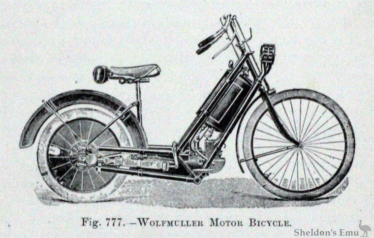 Among the next of the pioneer motor bicycles to attract attention was another German make, shown at Fig. 3. This was constructed by Wolfmueller & Geisenhof, of Munich, Germany. In ordinary appearance it resembled the conventional bicycle design intended for the use of women though the machine had exaggerated dimensions. The saddle was placed low so that the rider could rest his feet on the ground if he desired. The power plant was a peculiar form which was said to develop two horse-power, and which was capable of propelling the 110-pound machine at speeds ranging from three to twenty-four miles per hour. The motor was of the two-cylinder horizontal form having the cylinder heads at the front of the machine while the open ends of the cylinders pointed to the rear. The connecting rods extended to cranks attached to the rear wheel axle, and the drive was direct from the motor cylinders to the traction member as in locomotive practice. Ball-bearings were used at the ends of the connecting rod as well as supporting bearings for the rear wheels.