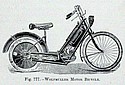 Over the back wheel - the place for the usual mudguard - is fitted a water tank, or cooler, from which the water circulates round the cylinders, keeping them cool and preventing any possibility of overheating. This reservoir of water is necessary owing to the high speed at which the engines run. The water stored here has to he changed after running 100 miles. The driving or rear wheel is built of two steel plates on the disc principle, in place of spokes, thus being absolutely necessary to support the weight of the motor and rider. The driving wheel is 24in. and the steering wheel 30in. in diameter, the pistons working direct on to the driving wheel.