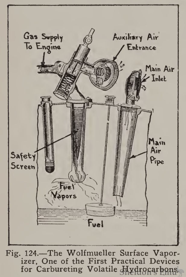 Benzol, as before stated, is the agent supplying the motive power - not benzine. Benzol and benzine are entirely different, and here it may be interesting to compare both products. Benzol is 80 specific gravity C6H6. 80c being its boiling point. Benzol is a by-product of coal tar. The benzine of commercial use is a hydrocarbon, of the formula CnH2n plus 2 and is a cheap by-product of kerosene, and similar in composition to gasoline. Benzine is quite unsuitable for motor use, and is also more volatile than benzol.