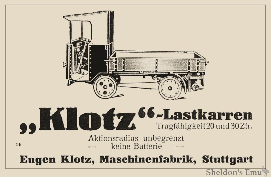 Manufactured by Maschinenfabrik Eugen Klotz in Stuttgart, Bahnhofstrasse 129, 1923-1926. Director G. Roau